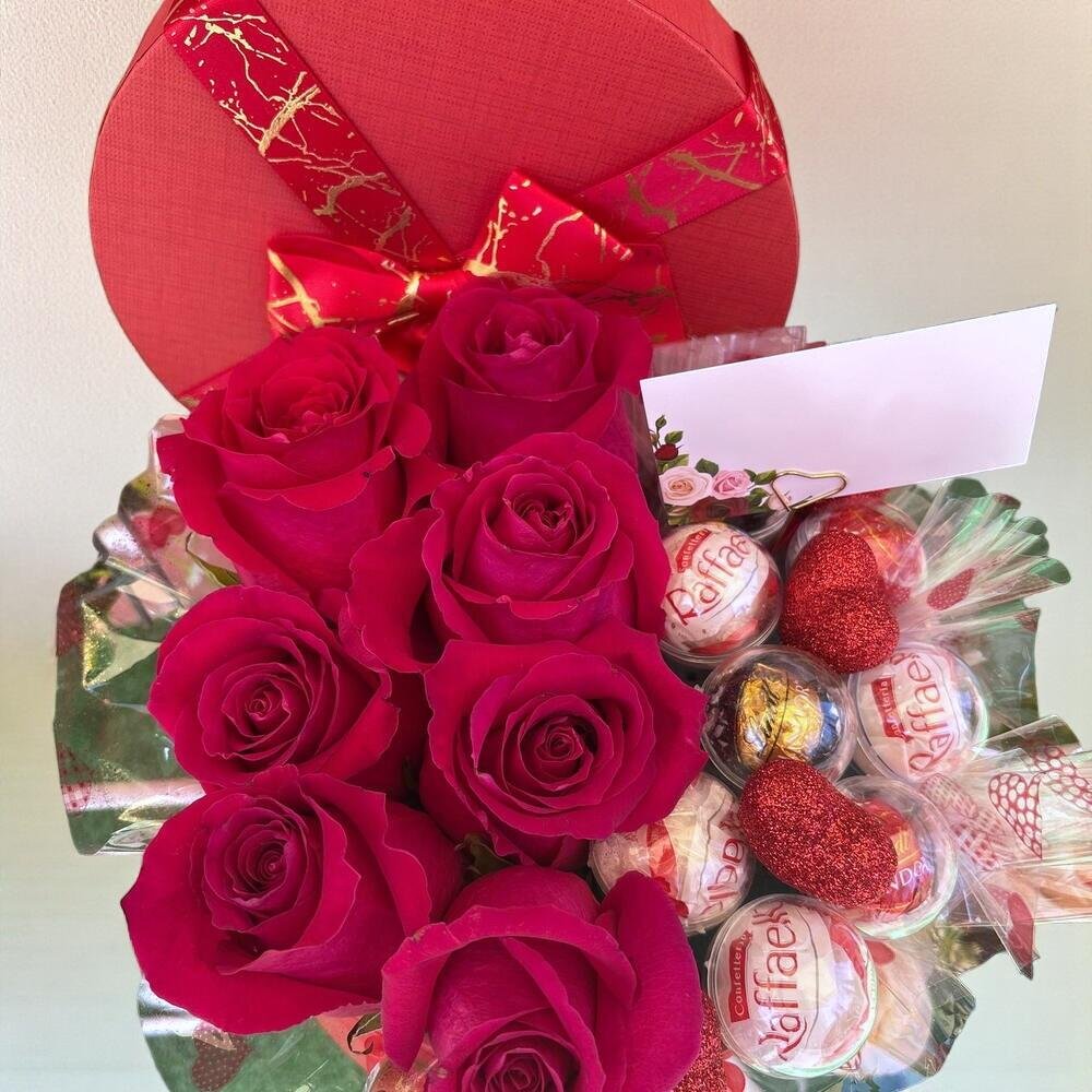 Hermosa Caja redonda de color rojo con medidas antes descritas con 7 rosas naturales rojas Ecu mondial tamaño 40, 3 bombones Rafaello y 3 bombones Lindor de diferentes sabores, trae corazones con purpurina de color rojo, y diseño en cintas color rojo y dorado con mensaje de feliz cumpleaños, las rosas vienen montadas en espuma floral hidratada para mantenerlas frescas por más tiempo, se entrega envuelto en celofán con lazo rojo 40,00 € IVA Incluido -