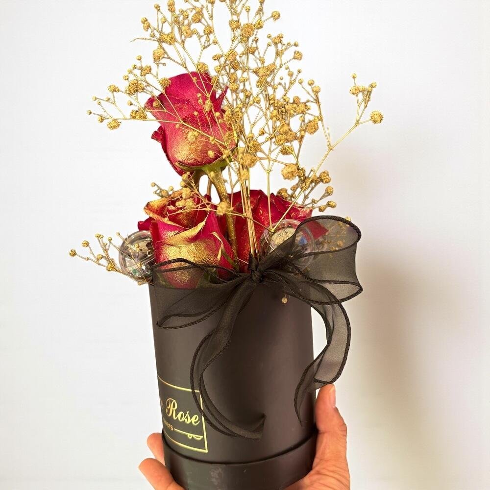 Presentamos una elegante caja redonda de color negro con letras doradas y mensaje escrito LOVE ROSE. Dentro, encontrarás 5 rosas naturales rojas y pulverizadas con polvo dorado para flores montadas sobre espuma floral para mantener su frescura. La caja incluye un porta chocolates con bolas plásticas transparentes que contienen deliciosos bombones rellenos de trufa y naranja. Un corazón de metal dorado sostiene las flores, las rosas están montadas en espuma floral hidratada, asegurando que se mantengan en buen estado por más tiempo. El producto se entrega envuelto en papel celofán, con un lazo negro o plateado, perfecto para sorprender en cualquier ocasión. 35,00 € IVA Incluido -
