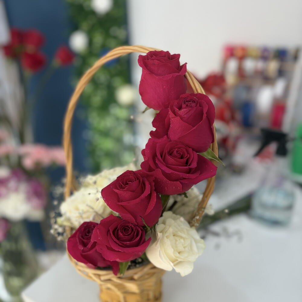 Cesta de Rosas Rojas y Blancas con Paniculata