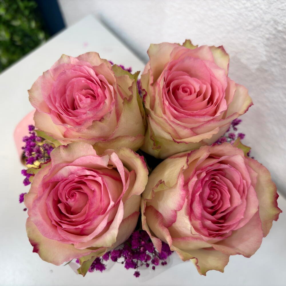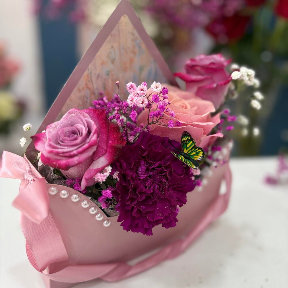 Hermosa caja de flores con dos rosas y Gypsofilia, Limonium y mariposas decorativas para sorprender. Viene incluida tarjeta de felicitación, 15,00 € IVA Incluido -