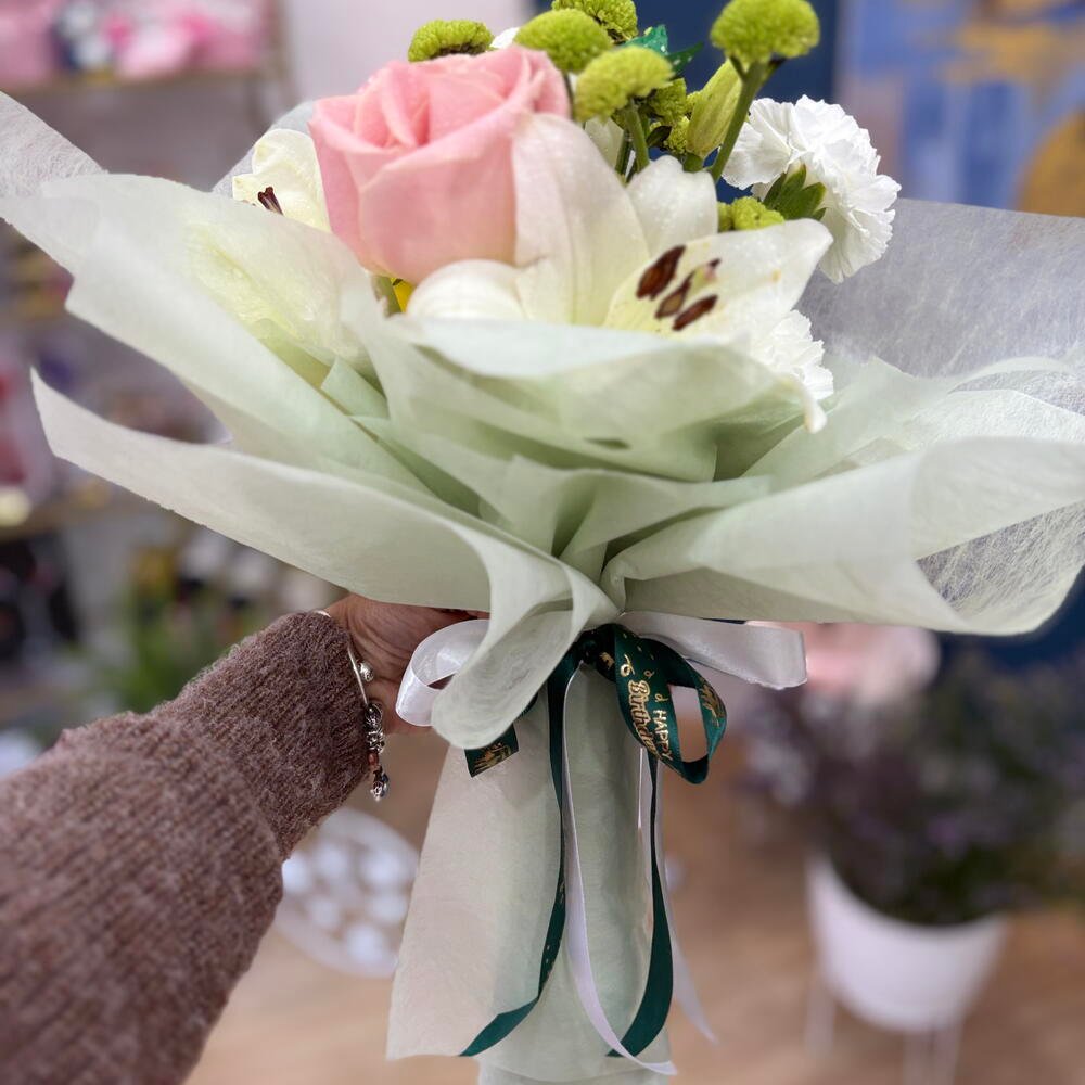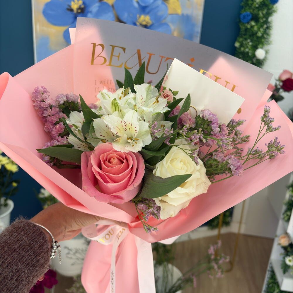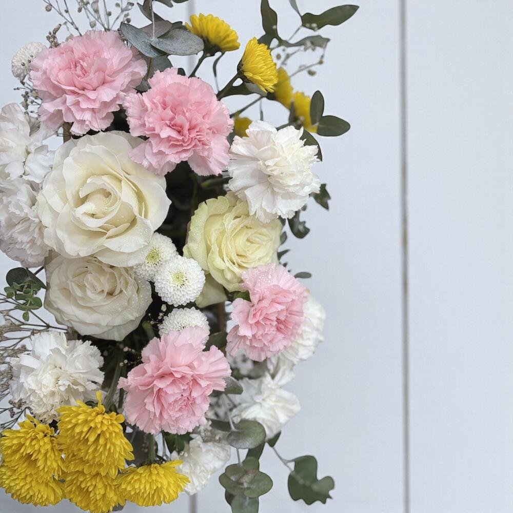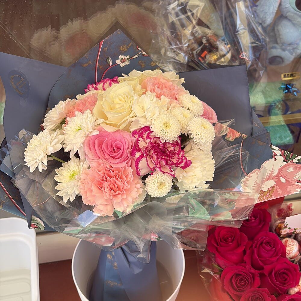 Sorprende con un ramo de flores frescas lleno de encanto y elegancia. Perfecto para aniversarios, cumpleaños, pedidas o cualquier ocasión especial, este bouquet combina la dulzura de las rosas con la alegría de los claveles y crisantemos. 45,00 € IVA Incluido