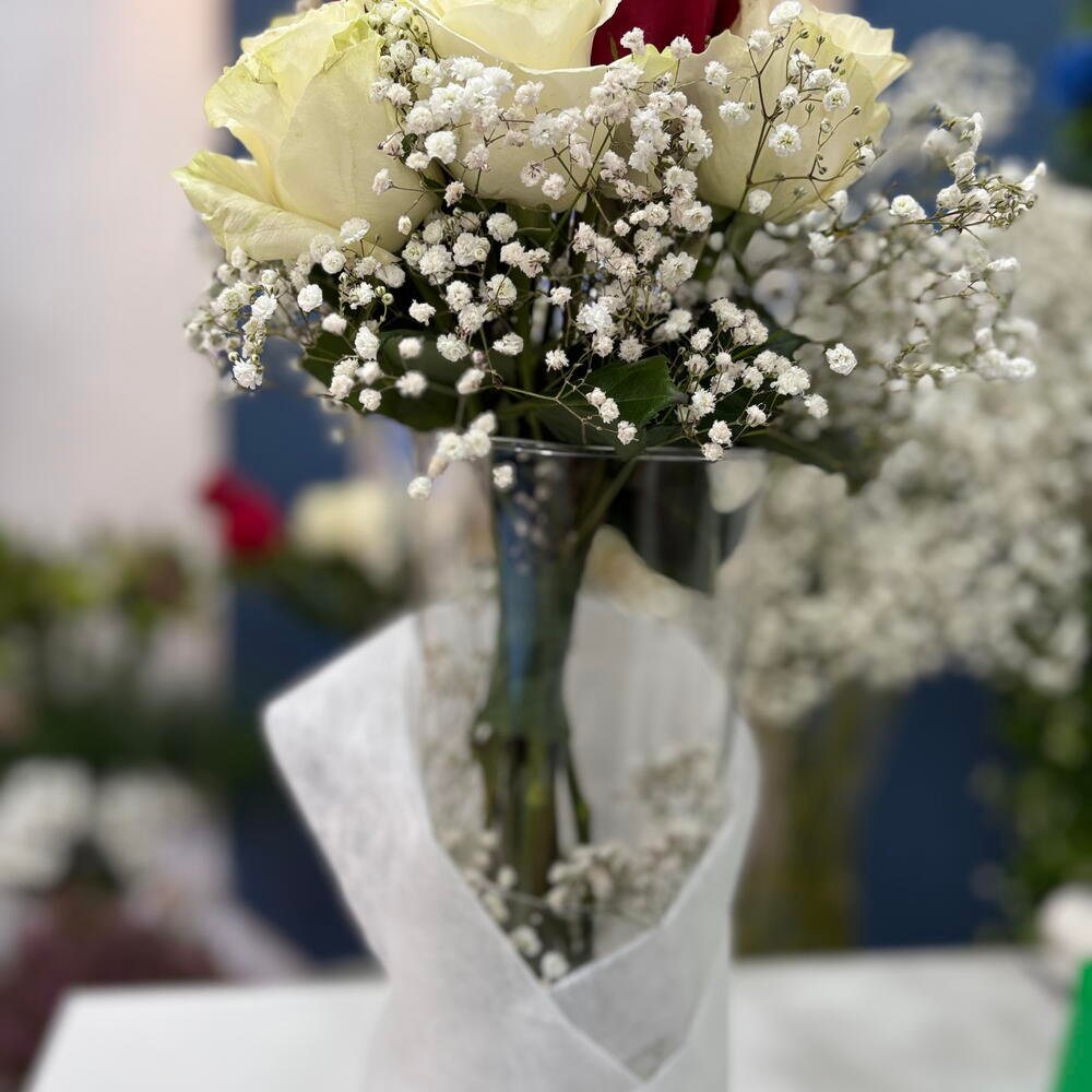 Ramo clasico de rosas rojas y blancas en jarron de cristal