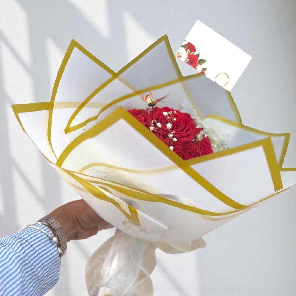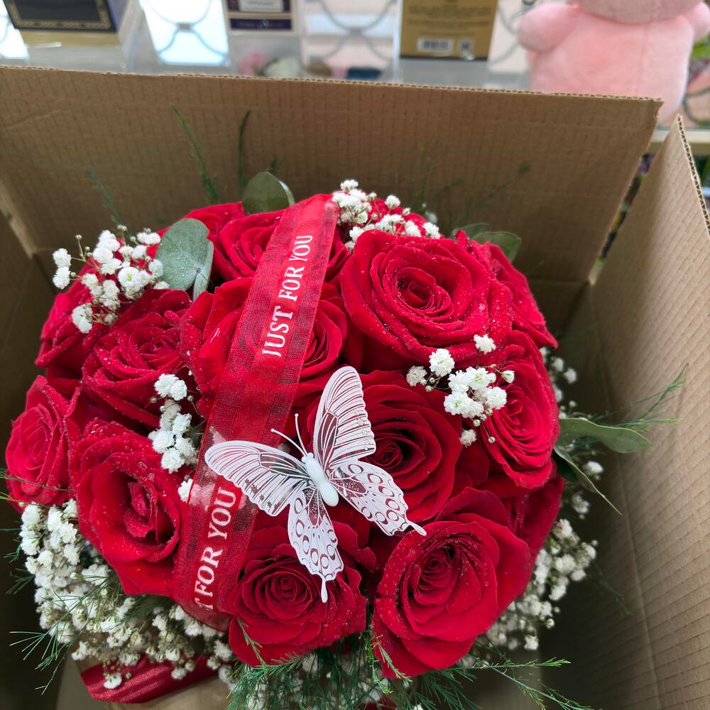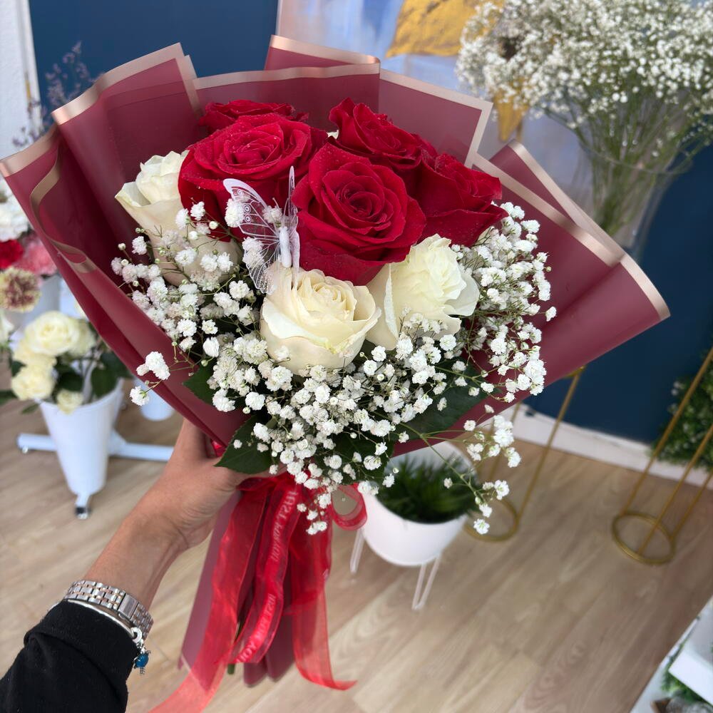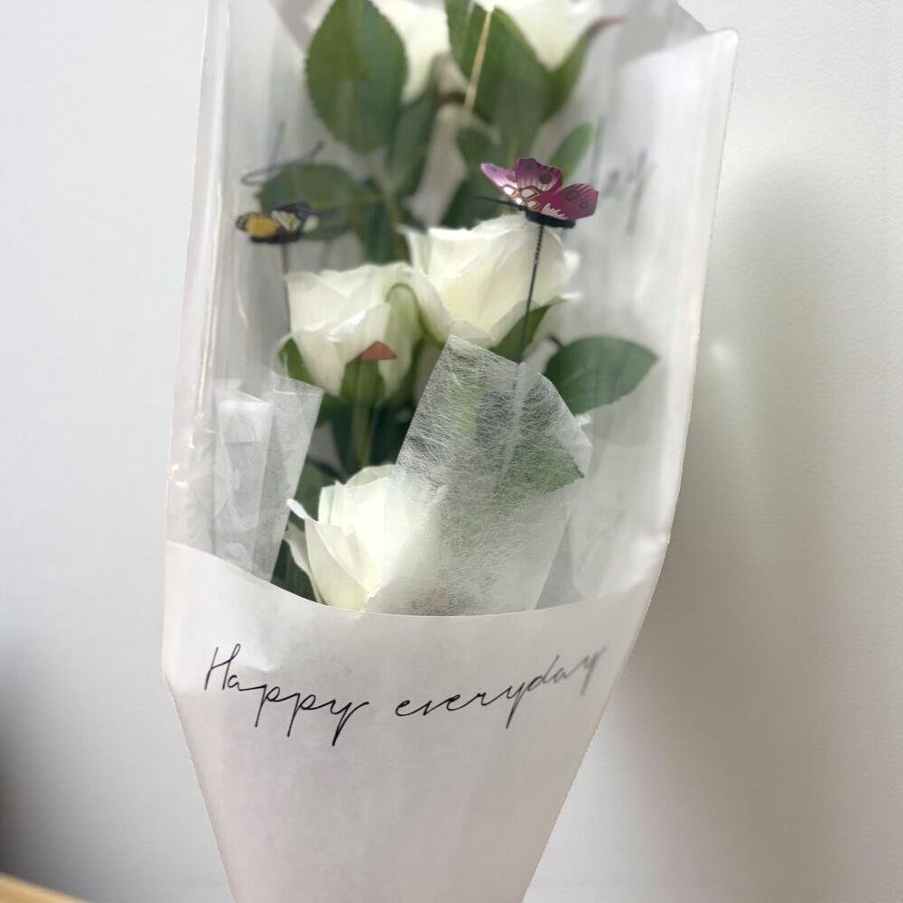 Ramo de 5 rosas rojas tamaño Ecu mondial 5 claveles de color rojo y dos ramas de Paniculata blancas envueltas en papel coreano blanco con bordes dorados y tarjeta de felicitación sin personalizar más mariposa flotante 28,00 € IVA Incluido -