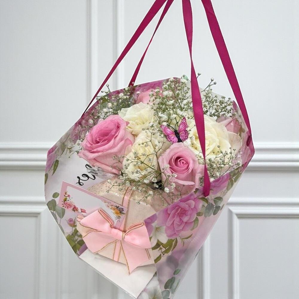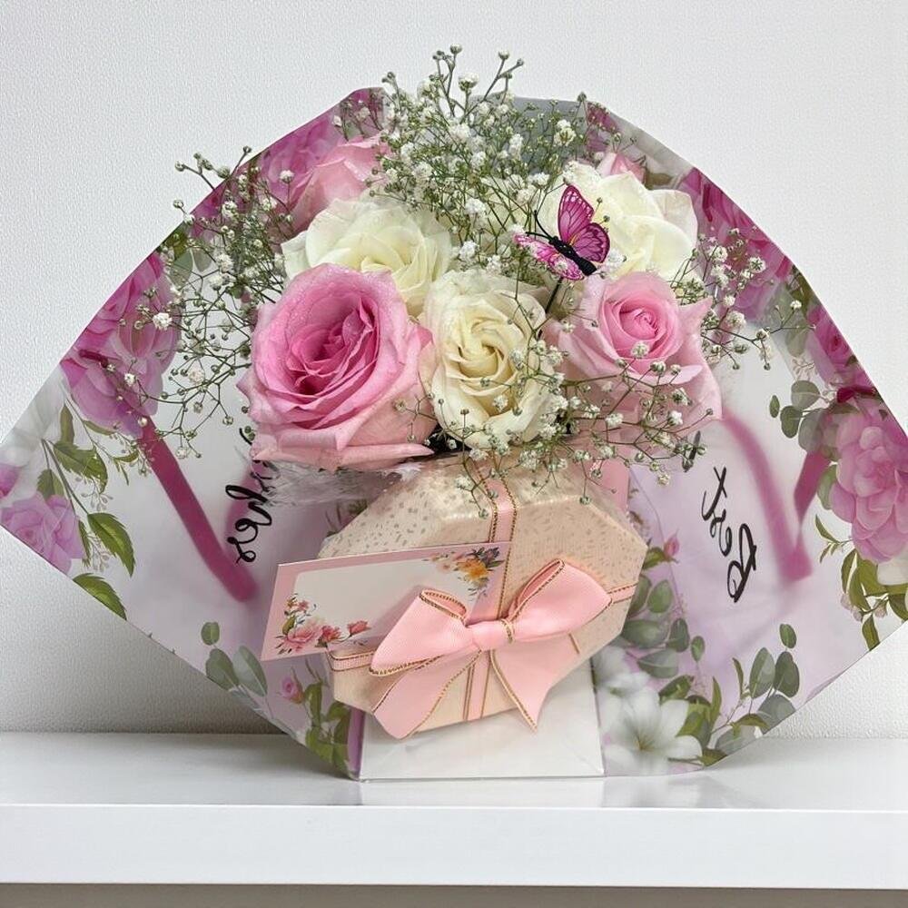 Caja de color rosada con rosas blancas y rosadas y tarjeta de felicitación, regalo glamoroso, para cumpleaños o festejos, las rosas se pueden conservar en la caja contienen espuma floral para mantener el producto fresco por más tiempo, caja puede presentarse en forma de exagonal o redonda