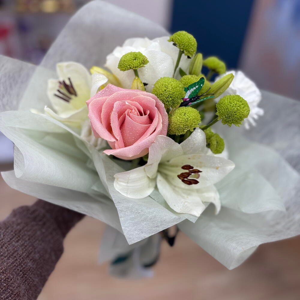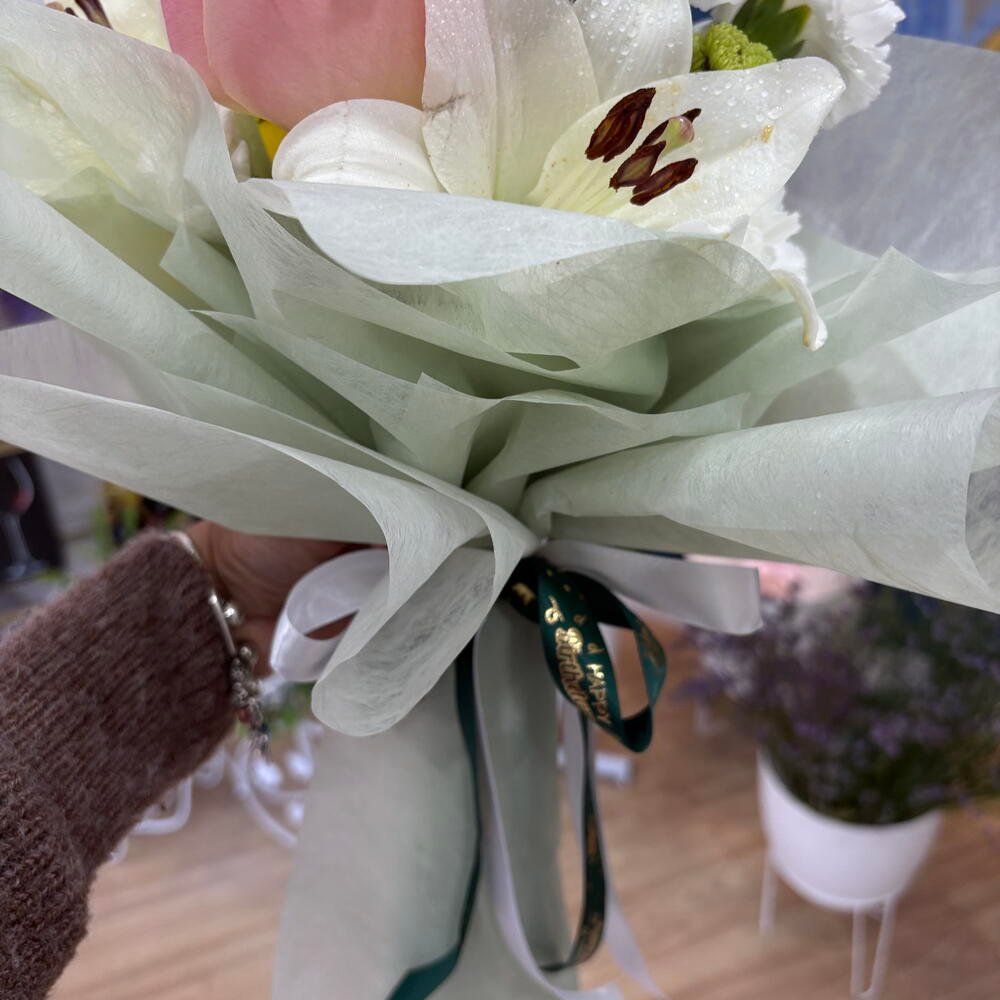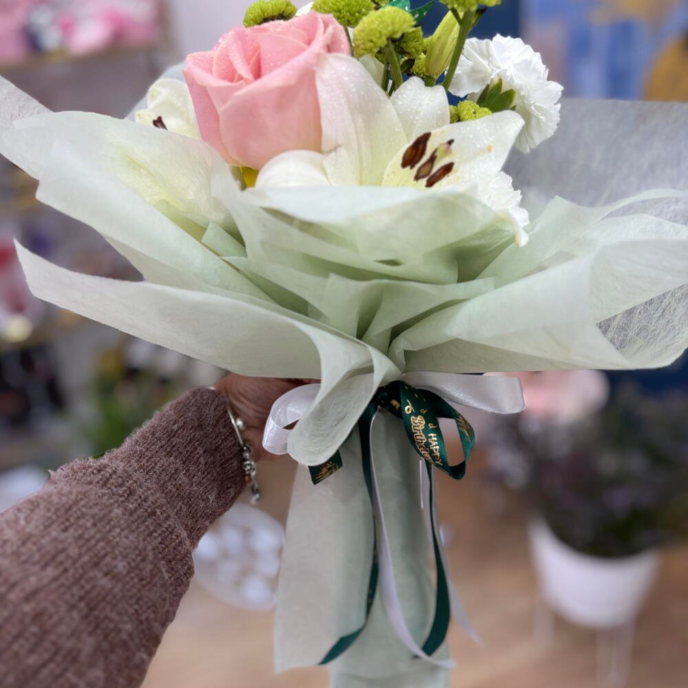 Hermoso ramo envuelto en papel tissu verde, romántico, moderno y sutil pero muy llamativo